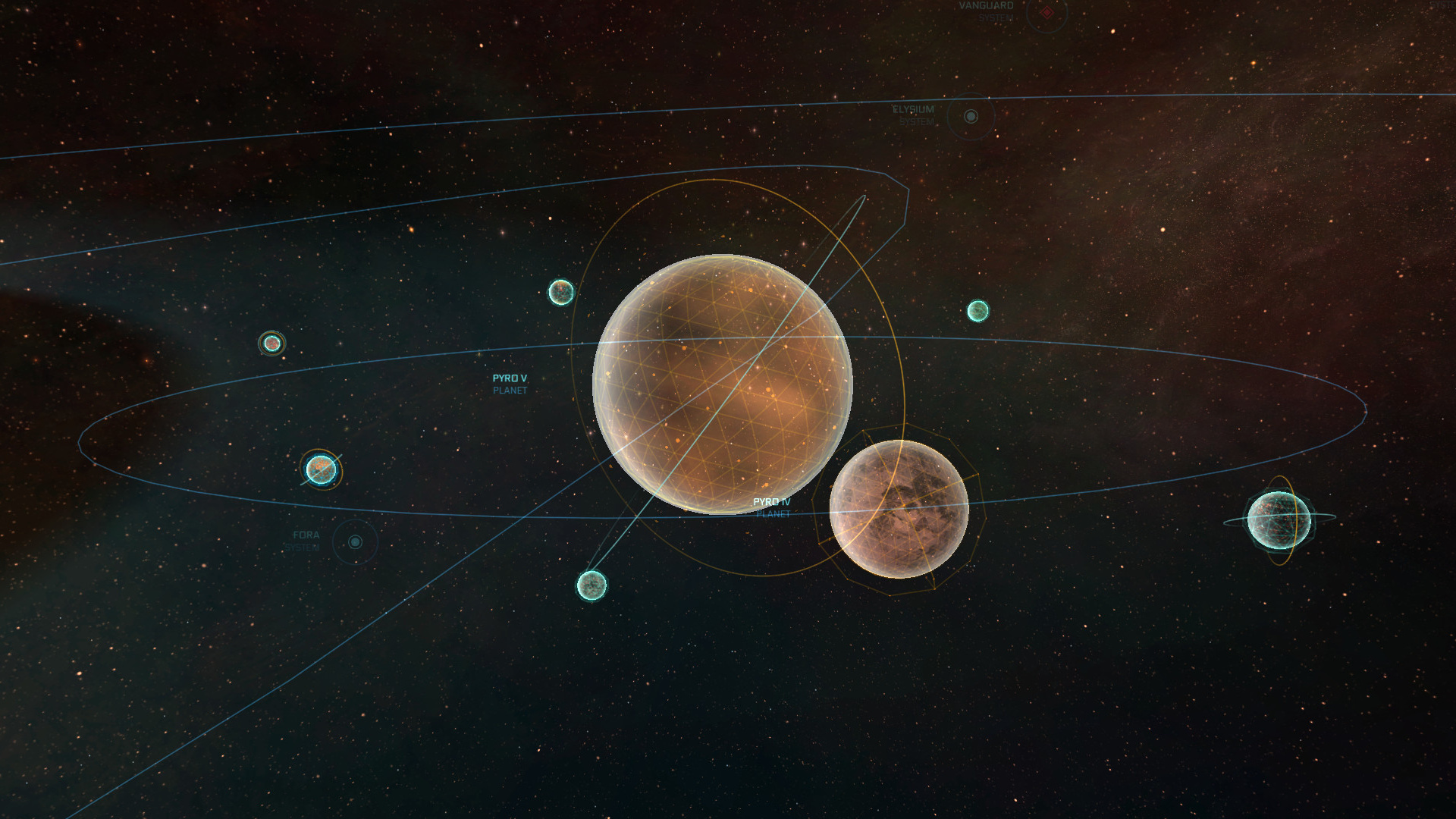Le couple formé par Pyro IV, une protoplanète rocheuse de type Mercure, et de Pyro V, une immense géante gazeuse jaune et verte, présente l’un des paysages les plus saisissants découverts à ce jour à travers l’espace connu. Pouvant désormais être considérés comme une entité unique, Pyro IV et V sont le produit d’un intense bombardement de météorites qui a dévié l’orbite de la première vers celle de la seconde. Pyro V donne désormais l’impression d’aspirer Pyro IV au ralenti, un spectacle presque sans équivalent dans le reste de la galaxie.